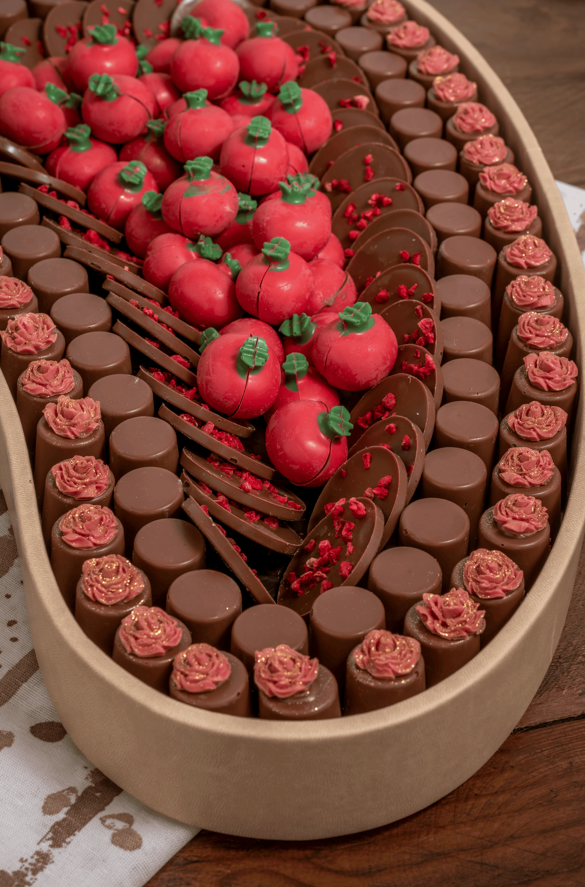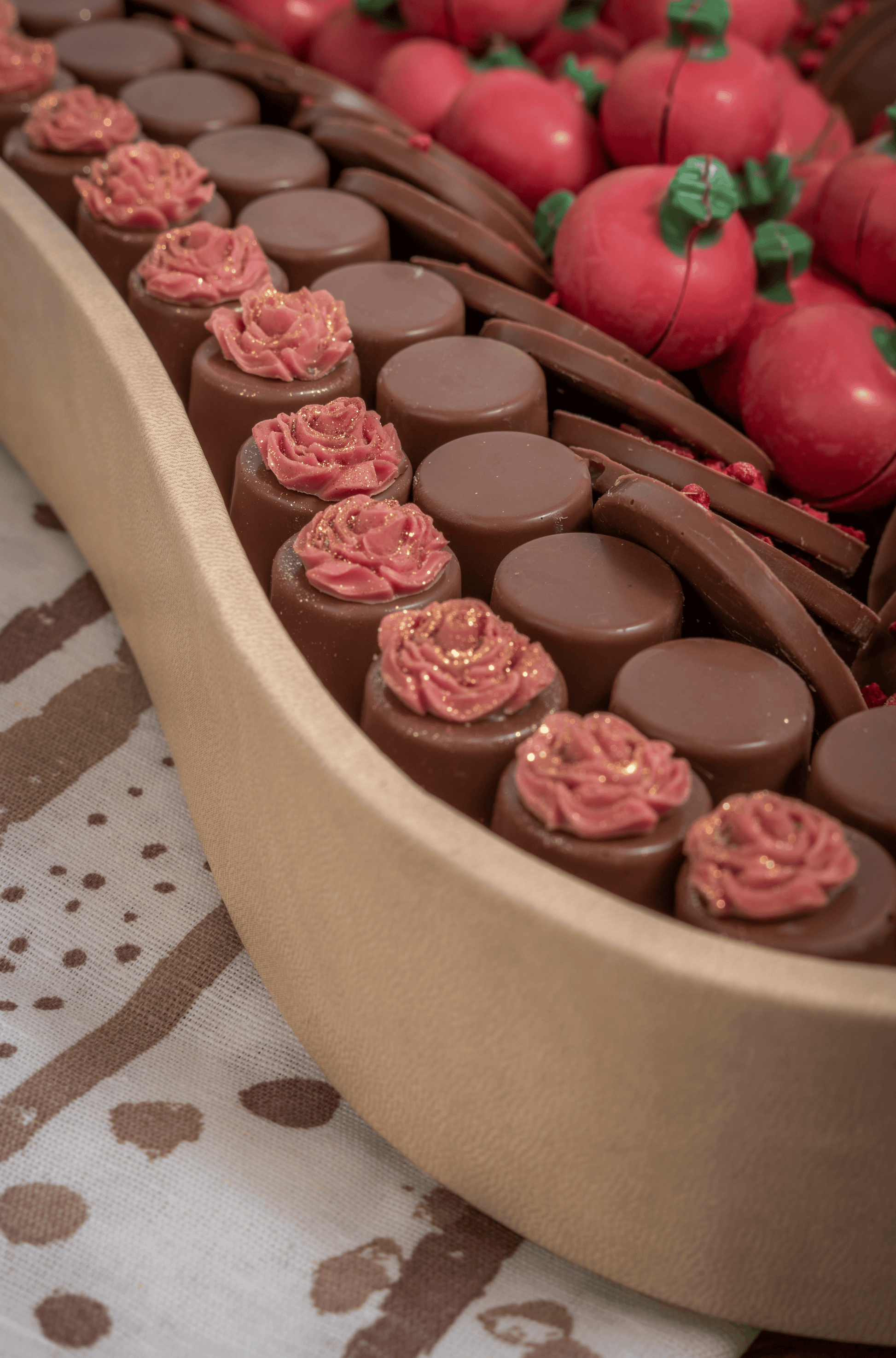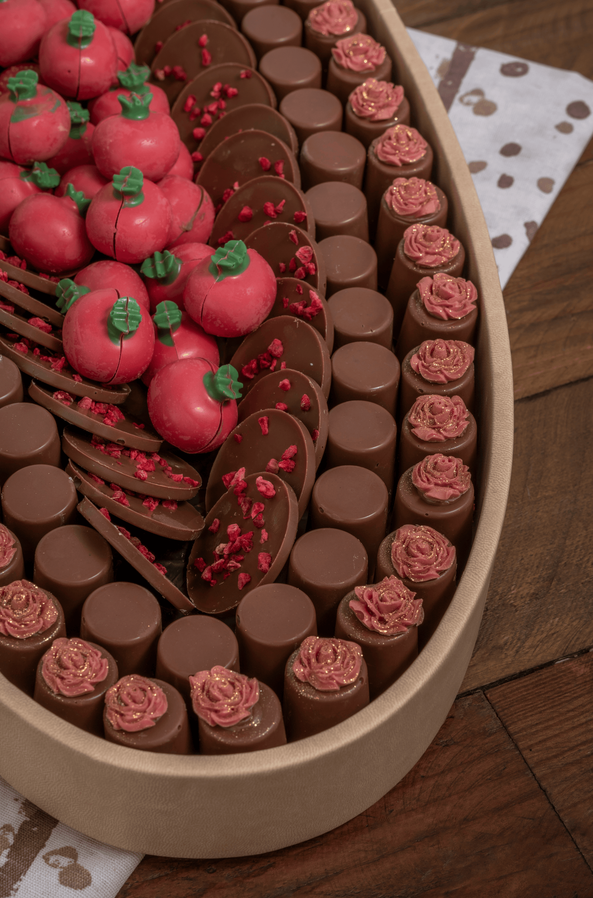 ✨ A rich variety of shapes and textures, including pomegranate-shaped and rose-topped chocolates