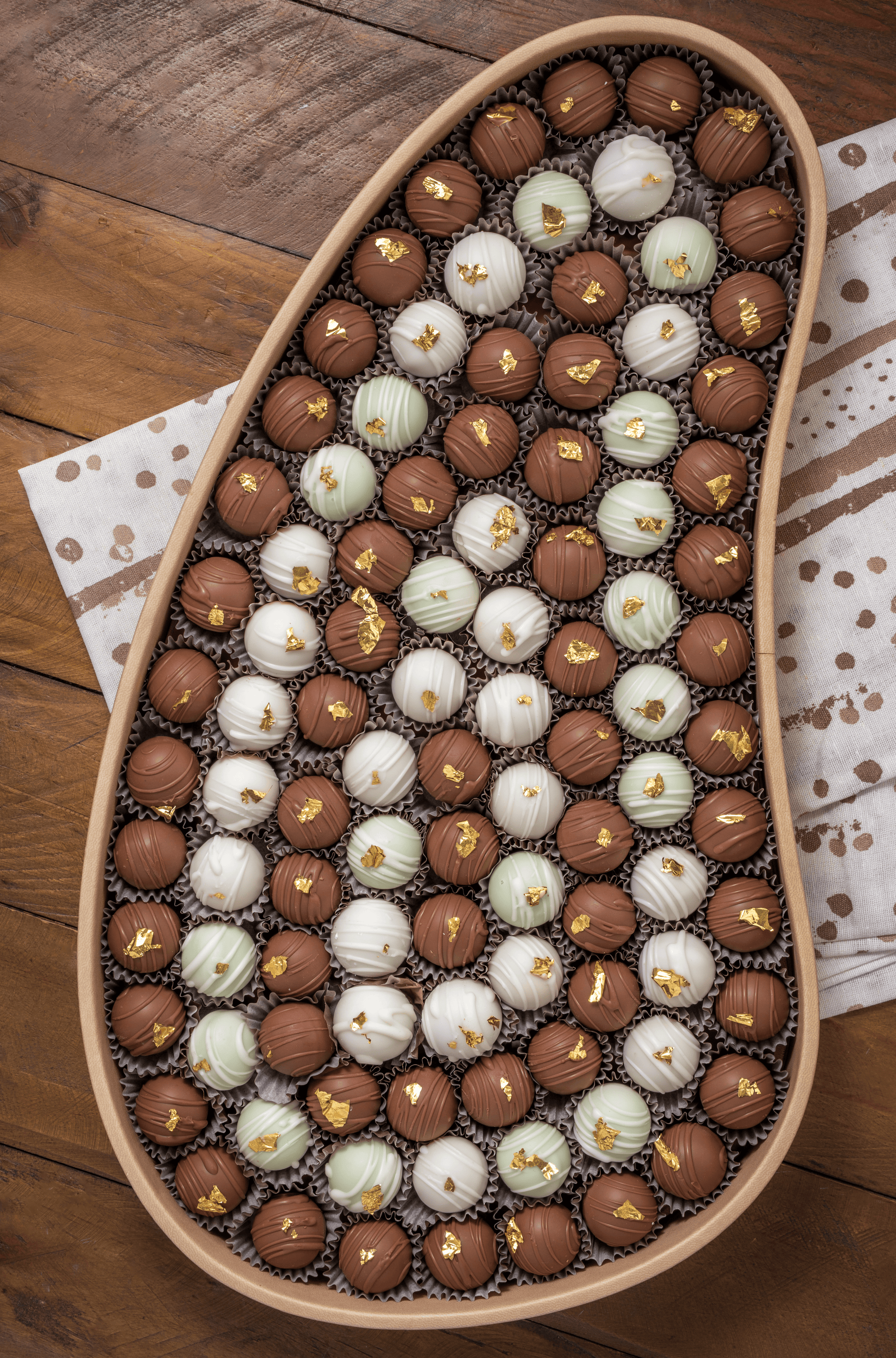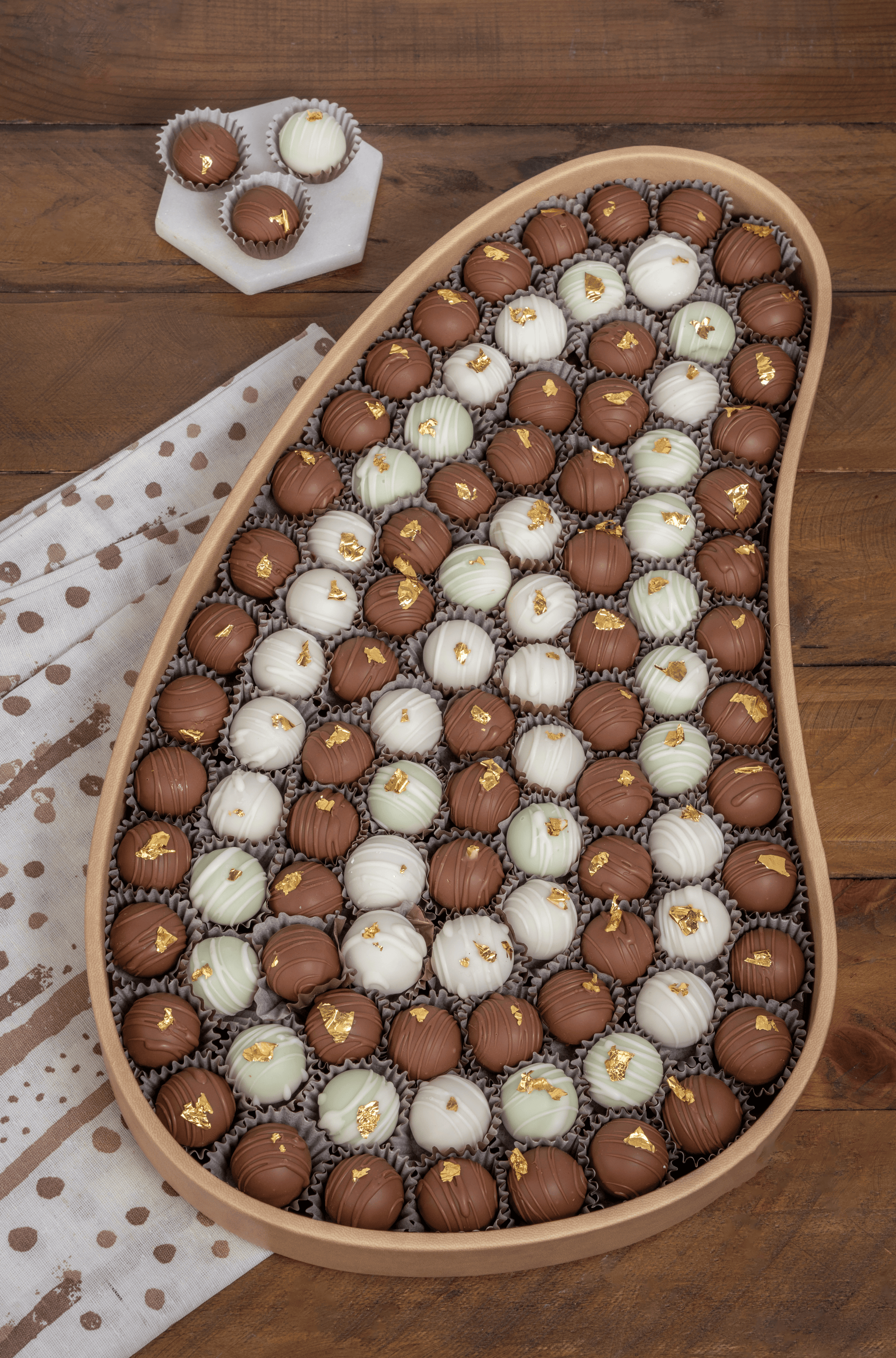 ✨ A flawless mix of milk, white, and green-toned truffles, finished with edible gold